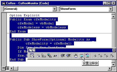 注意 严格说来,这里没必要把 mTestForm 置成 Nothing。Visual Basic 在破坏 CoffeeMonitor 对象时将把变量置成 Nothing。
