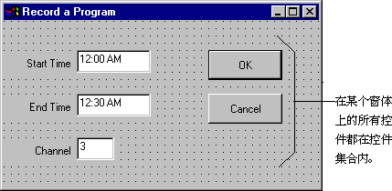 这两个命令按钮也共享这样一个特征,即它们都是控件。所有控件都具有公共特性,使它们不同于窗体以及 Visual Basic 环境中的其它对象。以下章节中将说明 Visual Basic 如何用集合使相关的对象分组。