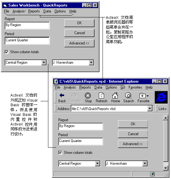Visual Basic 的 ActiveX 部件可以用在 Internet 和内部网上。图 1.2 显示的是一位业务分析人员在家中办公时通过他桌上的计算机查看表格,而另一位销售代表通过使用Visual Basic的ActiveX文档在 Web 页上查看相同的信息。