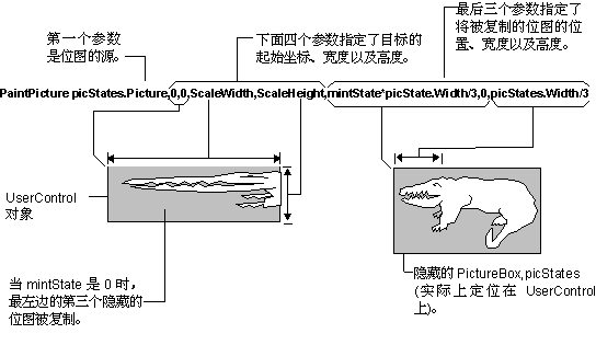 在 UserControl 的 Paint 事件过程中添加如下代码。当 Paint 事件发生时,此段代码会把存于 PictureBox 中的不可见位图的三分之一复制到 UserControl。具体哪三分之一将被复制将取决于私有状态变量 mintState 的当前值。