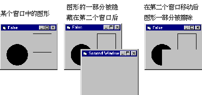 Microsoft Windows 操纵屏幕图象,来造成重叠窗口的影像。当一个窗口移到其它窗口上时,可暂时隐藏其它窗口,移过后,被覆盖的窗口和它的内容需要重新显示。Windows 管理和控制窗口与控件的重新显示。而用户的 Visual Basic 应用程序必须控制窗体和图片框内图形的重新显示。