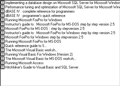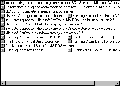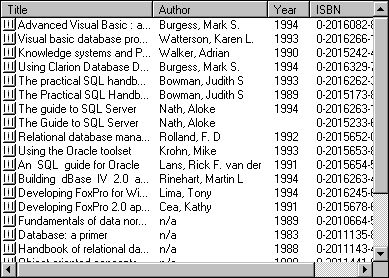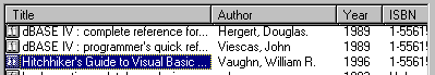 请注意在除报表视图以外的其它视图中,ListItem 对象只显示一个标签,即 Text 属性。但在报表视图下,每个 ListItem 对象可以有多个其它的文本项。例如,除了书名《Hitchhiker's Guide to Visual Basic...》以外,还有一个作者 ("Vaughn, William R.")、年代 (1996),以及 ISBN 号与其相关。所有这些文本项都是 ListSubItems 集合的成员。为创建 ListSubItem 对象,对 ListSubItems 集合使用 Add 方法这样,要设置 ListItem 对象的作者、年代和 ISBN 号,代码可能应如下面所示那样: